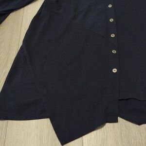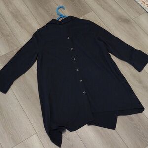 Tunic style 3/4 sleeve button down shirt with collar (faux buttons on back). Unique style and design. This top is a dark navy blue. It's is so soft and comfortable!