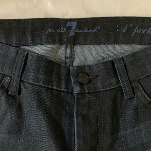 Dark navy jean with slight bootcut with 1 1/2" wide buttoned straight waistband with belt loops. Two back pockets have cross stitch detail and rows of tiny sparkles that glitter as you move! Measurements: 35" waist; 13" back rise and 8" from. 35" inseam. 20" hem. Color labeled as ST PTSBURG. Machine wash cold inside out or Dry Clean. Made in USA with imported fabric.