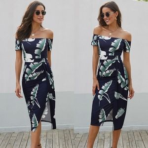 With its off-shoulder neckline and short sleeves, it adds a touch of sophistication to your look. The dress features a stylish slit, adding a hint of allure. Falling at a flattering midi length, it is perfect for both formal and semi-formal occasions. Whether it's a cocktail party or a special event, this dress is sure to make a fashionable statement.