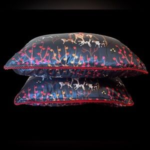 Set of two decorative pillows with a black background and red horse print. Perfect for adding a unique touch to any room.