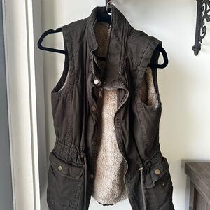 Love this vest, the green is pretty, the inside of it is furry and cozy even though it's a short sleeve. Great to add to a long sleeve or flannel with jeans and boots in the Fall or Winter!