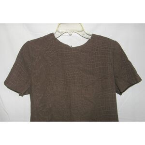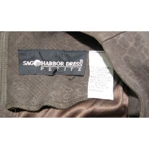 This soft faux suede brownish green dress is gently worn, no rips or stains, slightly 'pilly', might have some wrinkling with shipping. It is size 8P and made by Sag Harbor. It has thin shoulder pads and zips up the back. It measures 18 1/2" across at the bust, the hips measure 19" across and it is 35" in length. Nice dress.