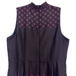 Dark Wine Maroon. Polka dot. Back zip closure, Mock neck (smocked), Sleeveless. Lightweight, non-stretch, fully lined. Two front pleasts on skirt. Below knee length (≈43 inches). Easily layers under a cardigan or blazer.