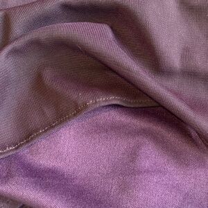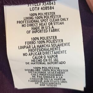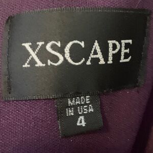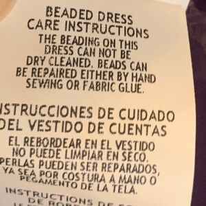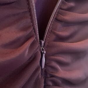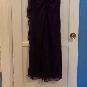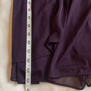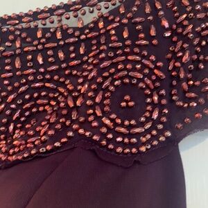 Eggplant purple chiffon-like beaded gown. Has a lot of stretch, but the seam around chest is firmer and about 29". From shoulder to hem about 54". Lined, zipper at the back, very soft and comfortable. Worn once for a photo shoot, in very good condition. (The real color is the darker shade in the photos.)
