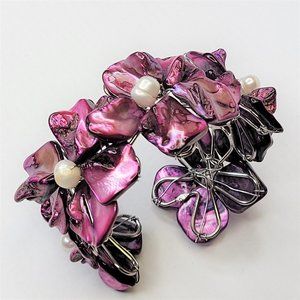 Dark Purple Pearl Floral Adjustable Cuff Bracelet Bangle
