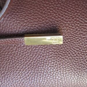 Features Vegan Pebbled Brown Leather, gold metal hardware, Double compartment exterior with 2 outside pockets on one side and a larger pocket on the outside on the other side.