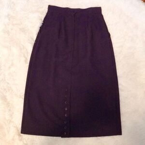 Dark Purple Vintage Wool, high waisted Skirt. Has pleating at the top and slightly hidden pockets. Beautiful button detail up the bottom back side! Unlined. Partial zip with top button closure. Excellent condition!
