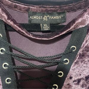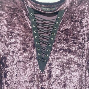 So many amazing things about this one! Just the fact that you can wear her as a top or a dress is RAD! The soft, luxurious purple crushed velvet, black lace-up V-neck cut-out, hi-low raw edge hem! Sooo much to love!!