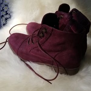 Fun dark berry colored boots with a low heel. Lace up front with side zip for easy wear. Soft suede-like fabric upper with stitched details for a classic look. Only worn once or twice, in like-new condition. Size 7.5, seems true to size.