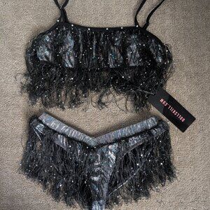 This cowgirl costume set has a shimmering fringe bra top, matching cheeky bottoms