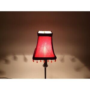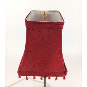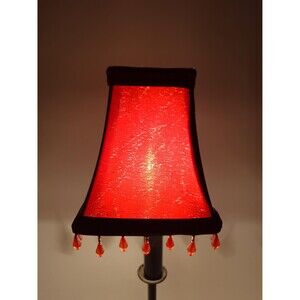 Small tapered dark red fabric lamp shade, with red outer and white inner layer. The shade has faux crystals on the bottom all the way around. The shade clips on standard candelabra size (E12 base) bulbs.