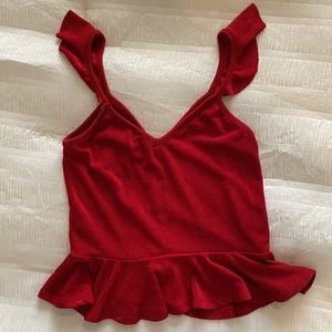 Dark red ruched top with tie at bottom. Size XS. Soft Polyester material.