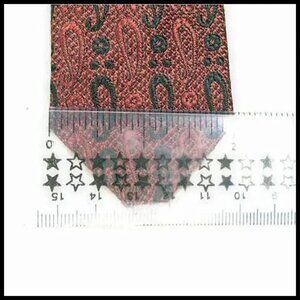 Be subtle but still edgy in this dark red / burgundy skinny tie has a stylized paisley in black. DEFINITELY enlarge the photos to get a good look at the texture on this tie. I have taken them so you can see every tiny detail. Self tipping. No maker name, just imported fabric, which is damask. 57 1/2'' long and 2'' wide. A small piece of the interlining shows out (shown) on the bigger blade. It's not a hole. This is flawless.