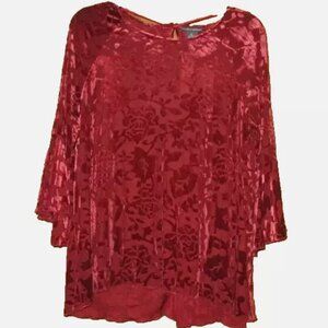 Chelsea and Theodore dark red floral velvet pullover high low top with bell sleeves. Size medium, bust is 38", length is 27", sleeve length is 17". Nylon/rayon/spandex fabric. New with tag.