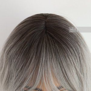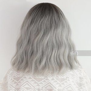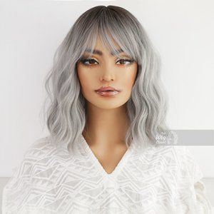 Beautiful Dark Roots Silver Ombre Wavy Wig. Made with heat resistant synthetic fibers so the hair can be styled with a curling iron or flat iron under 250F° degree. The cap is adjustable for easy wear. The hair at front is designed with hair bangs which mimics the look of a natural hair look and is also more comfortable and Breathable. The hair parting is fixed.