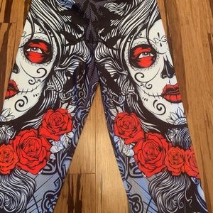 Show off your crazy side wearing these fun leggings. Nice silky comfortable material with stretch. Brand new without tags. Measurements as follows.