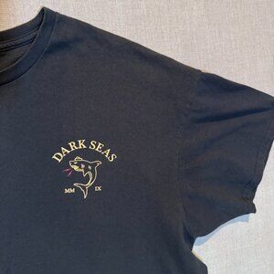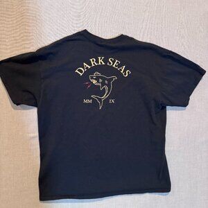 Dark Seas Division short sleeve t-shirt in black. Features shark and “Dark Seas” logo graphic on both front and back. Classic crew neck, 100% cotton, and relaxed fit.