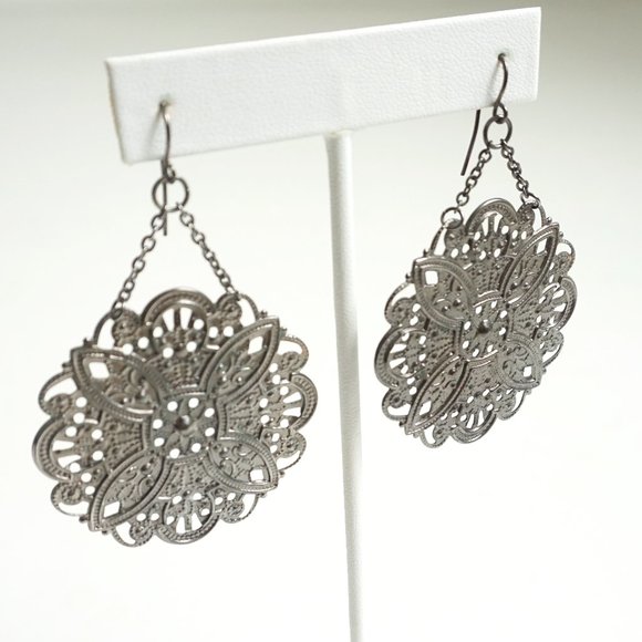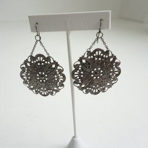 adorable dark silver metal chandelier earrings. round design with ornate detail. in excellent condition!