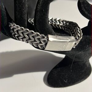 This listing is for a dark silver tone metal bracelet which is likely made for men to wear but it can definitely be worn by anyone. The clasp can be tricky on this design but once you get it, it’s easy. This bracelet is heavy, comfortable and nice to wear.