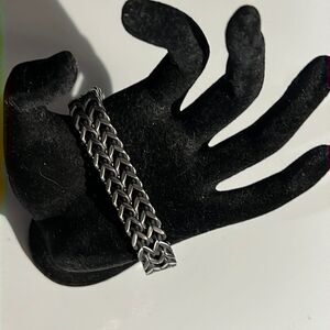 Dark Silver Tone Metal bracelet which is likely made for a male to wear but it can definitely be worn by anyone. This bracelet is heavy, comfortable and nice to wear. This one has a decorative back to the closure area and is almost exactly like the other silver men's bracelet listed. Subtle differences.