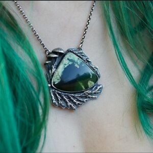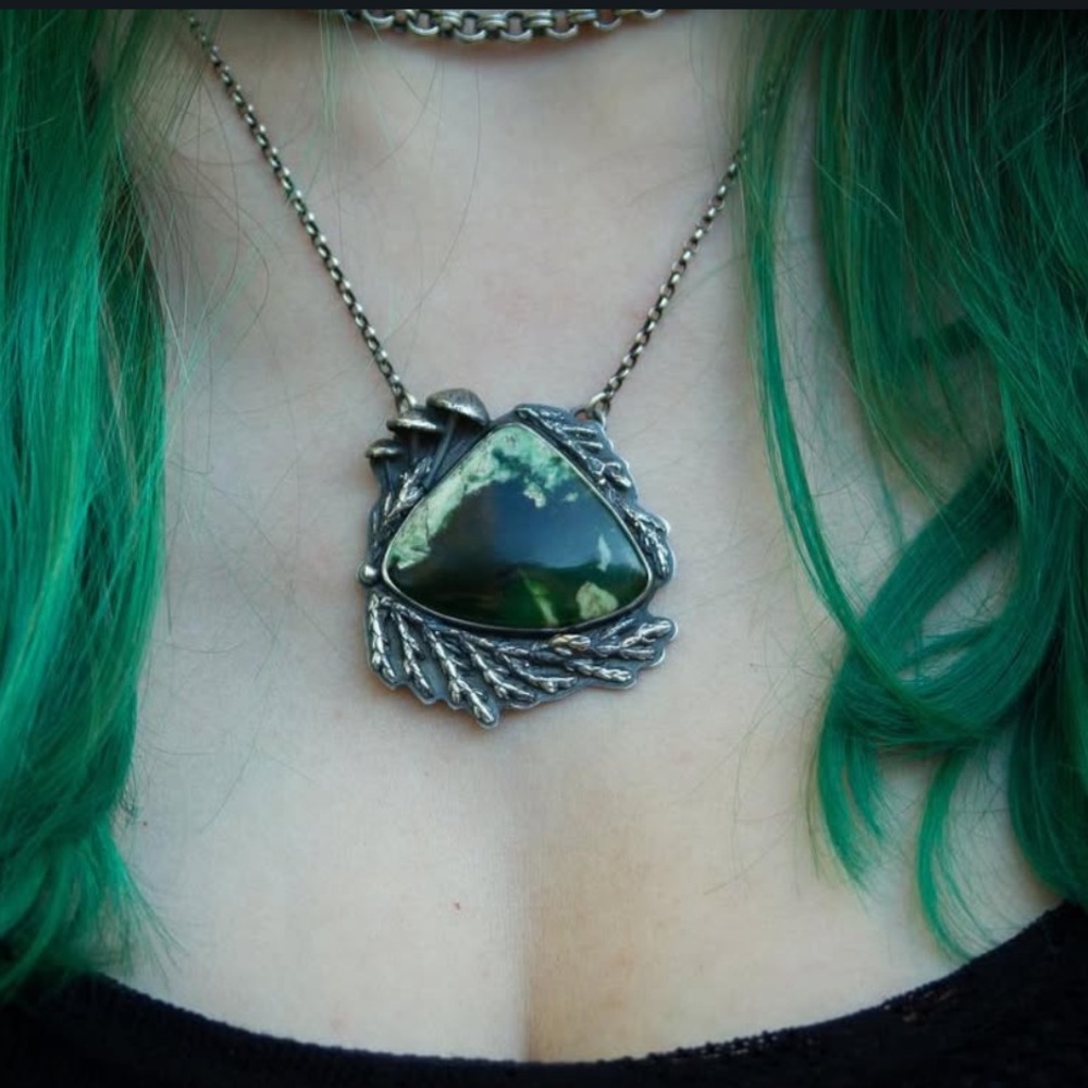 New handmade necklace by Fay Woods Designs. Chrome Chalcedony set in sterling silver with handmade mushrooms and casted cedar leaves. 16-18 in adjustable sterling silver chain.