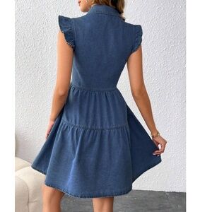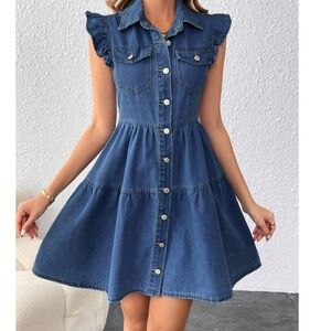 Dark Wash Button Ruffle Sleeve Denim Jean Dress