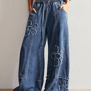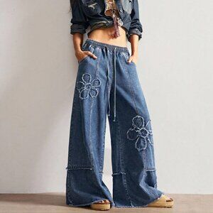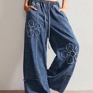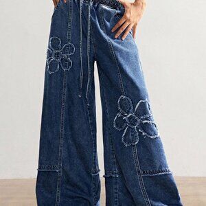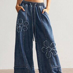 Dark Wash Casual Women's Wide Leg Baggy Jeans With Designs