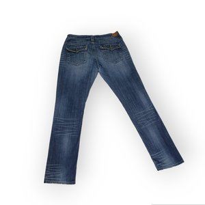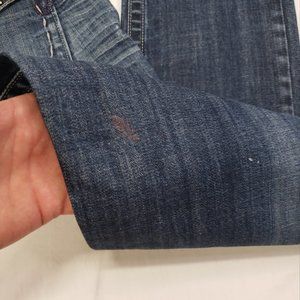 Jeans are preowned, used. Manufactured distressing, hole below right front pocket. Mild freying of back ankle cuff edges. Inside corners of back pockets are thinned & shows when held up to light. Does have a smudge (?) mark mid left thigh & dark colored spot on right back, mid thigh, which is shown & can be viewed in photos.