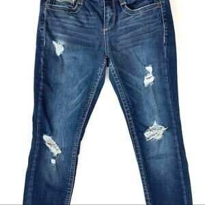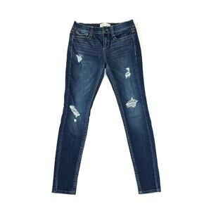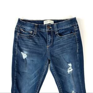 Mudd FLX Stretch dark wash skinny jeans, distressed detail, zip and button closure, functional front and back pockets, good condition