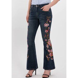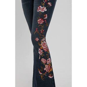 Take your look to the next level with these dreamy embroidered flare jeans! Featuring intricate floral embroidered patchwork over a classic vintage 70's bell bottom construction. High waisted fit. Bold, flared ankles. Dark wash, blue denim. Zipper closure. Get ready to bathe in compliments with these charming floral embroidered bell bottoms!