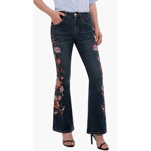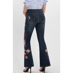Dark Wash Floral Embroidered Patch High Waisted Flare Bell Bottom Denim Jeans