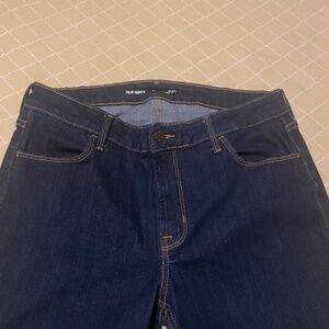 Dark washed Old Navy Size 12 Mid Rise Jeans. New condition, only worn once. Nothing wrong with them I gained weight. Very comfy. Straight leg and able to wear with boots or open toe shoes and sneakers. Loved these jeans ordered a bigger size and have the same ones in the next size. Very good condition!