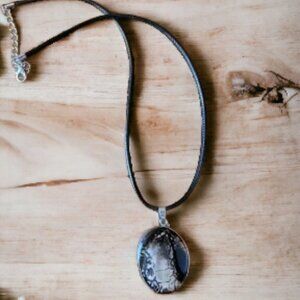 This black cord necklace has an oval shaped stone that is the same on both sides. It is 9 1/2 inches (19 inches stretched out) on a black cord that has an size adjustable clasp. The pendant is a light brown with dark and black undertones and is in an oval shape. It is 2 inches in length. Great for wearing with black or brown tops. Perfect for a gift or for keeping for yourself. New, never used.