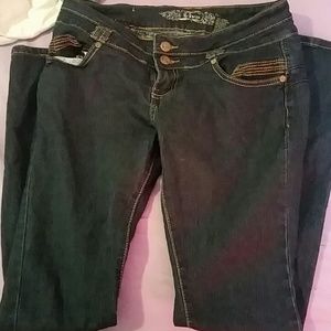 Dark blue jeans, 75% cotton, 22% Polyester 2% Spandex. Double button in front, nicely fitted, front and back pockets, designs on back pockets as well. Uses really small belt if needed