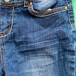 These dark denim jeans are close-fitting trousers made of dark material or denimlike fabric, having pockets with brown trimming along the edges