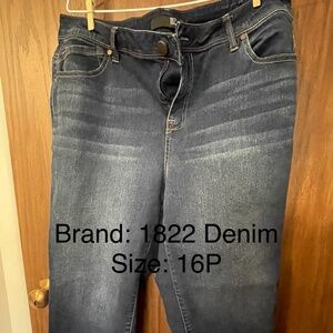 Dark blue jeans, tapered leg. Brand: 1822 Denim. Size 16P
