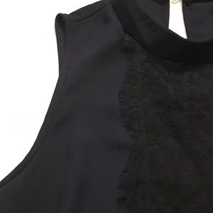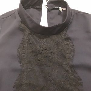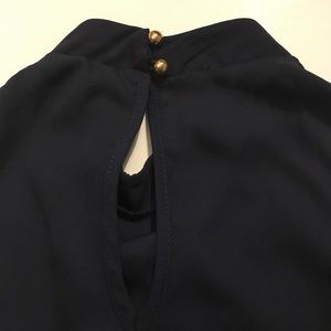 NEW without tags. Never worn! Amazing condition; no stains, scents or tears :) Super cute for going out! Egyptian neckline with black lace accent down the front middle. Back is a solid dark blue color like the rest of the shirt. Color is pretty true to pictures, very dark blue almost black/indigo color. Size is XS and is from Charlotte Russe. Back of neck connects with loops around gold buttons, reliable material for loops & not loose. 100% Polyester & thin material.