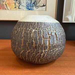 Wonderful piece I have no idea who made it. It is signed, but I cannot make up the signature. Maybe it says fern or something like that. It is incredible finish. The crackle glaze is amazing. It’s quite heavy so it will require lots of packing . Please take that into consideration we’re making an offer.