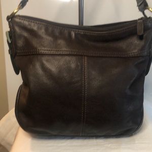 Dark brown genuine leather shoulder handbag. Preowned. Photos show wear on the straps but still a beautiful handbag. 3 compartments in bag. Gold hardware. Reasonable offers welcome! Thank you! 😊