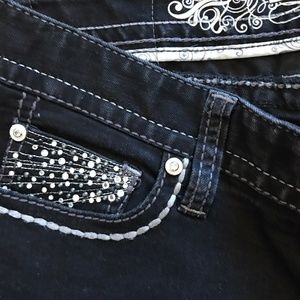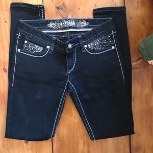 Express dark wash denim jeans. The jeans are skinny, slim-fit, and feature contrasting white stitching along the seams around the front pockets. Embellishments are visible on the front left pocket, consisting of small rhinestones arranged in a radiating pattern. The waistband has a button closure and belt loops, and the inner waistband shows a decorative pattern. Express Jeans Size 4. A few rhinestone are missing. Used condition.