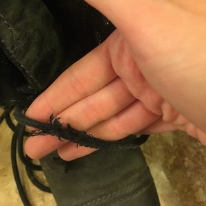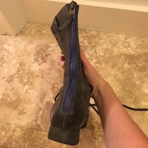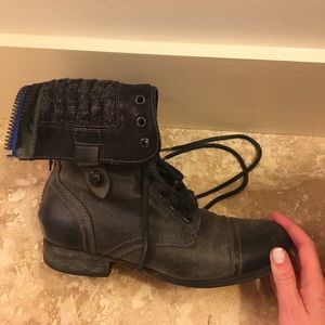 Dark gray Steve Madden combat boots with blue detail on zip in the back. Sweater like material on interior. Can be folded down