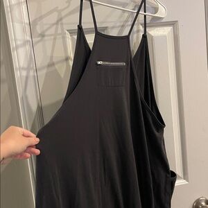 Dark gray jumpsuit with spaghetti straps. Features a relaxed fit and side pockets. Straight leg