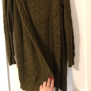 Long (just past butt length) dark olive green sweater. Opens in the front and has a hood. Just a little too small for me.