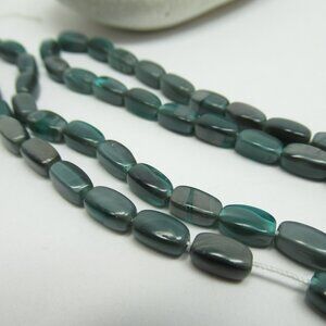 This listing is for the strand of 50 vintage dark Czech Uranium glass beads pictured. They have never been used, are vintage stock and come temporarily strung on the original factory string. These beads are a fun squared off rectangle shape and are a beautiful dark grey color with teal mixed through. They glow lightly under blacklight. Parts of these beads glow under blacklight because of the Uranium used in making and coloring the glass.