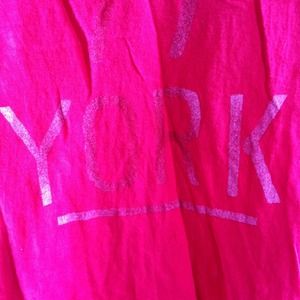 Dark pink tight fitted t-shirt. "New 77 York" written on front in faded white