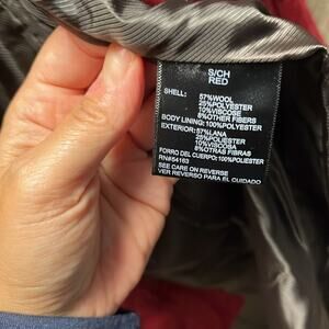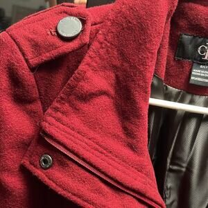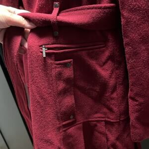 Reddish maroon CK jacket size small, nice lining on the inside, heavy and warm, button up with zipper and snap buttons and belt, 4 pockets, 2 that zipper. In excellent condition, comes from pet free/smoke free home