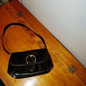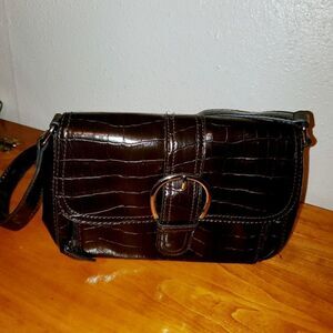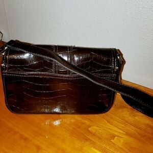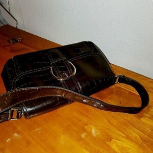 Dark brown animal print texture shoulder purse. Faux leather. Khaki lining. Pre-owned in almost like new condition. Please refer to pictures for best description and condition verification.