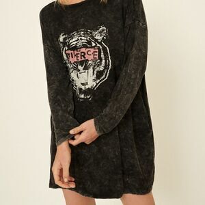 This t-shirt dress is yummy soft! Perfect for traveling in or just for lounging around the house and lookin CUTE! Generous fit, I would suggest sizing down one size if you don't want the "oversized look". Can be worn up or slightly off one shoulder. See photos.