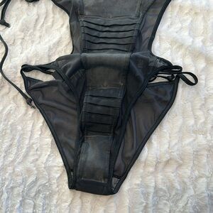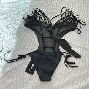 Darker Wavs Bodysuit Strappy black / grey mesh jersey self tie medium new w tags