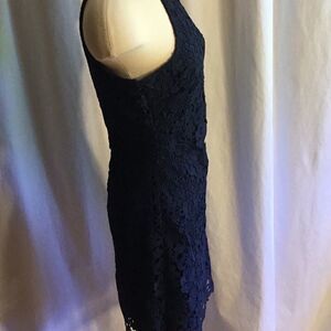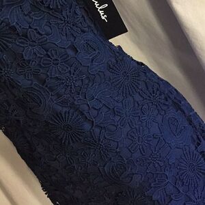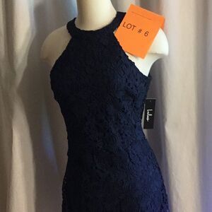 Gorgeous act blue dress with zipper back & neck hook closures. Size is medium. Crochet outer with a matching blue lining in this dress, dress is fully lined. NWT by LULUS. Measurements are as follows: bust 34”, waist 27”, hips 31”, dress length 32”.